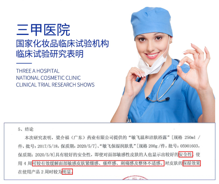 敏飞润肤乳经过三甲医院国家化妆品临床试验机构的敏感肌肤实验认证,安全有效,可有效缓解皮肤紧绷感,瘙痒感、刺疼感,给您的肌肤安全放心的守护。