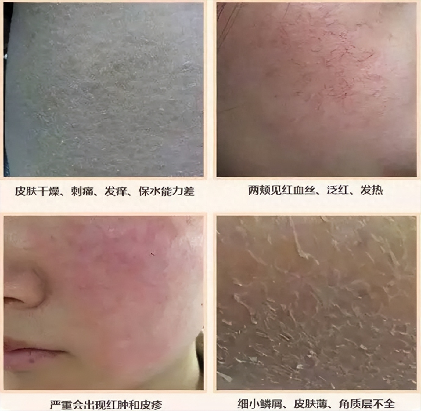 皮肤薄、脆弱,毛细血管显露,不均匀潮红,有痒感、红疹,皮肤有烧灼感,对各种轻微常规外界刺激敏感,有时皮肤瘙痒、紧绷、干燥脱屑,对一般的护肤品不耐受。