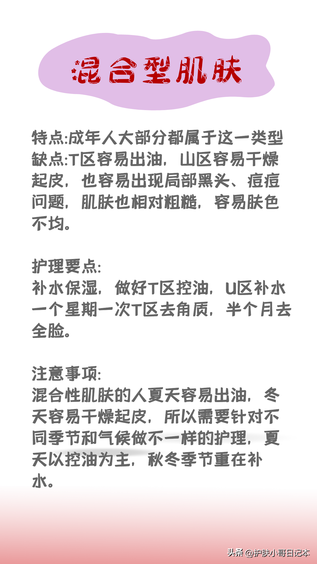 特点:成年人大部分都属于这一类型缺点:T区容易出油,U区容易干燥起皮,也容易出现局部黑头、痘痘问题,肌肤也相对粗糙,容易肤色不均。