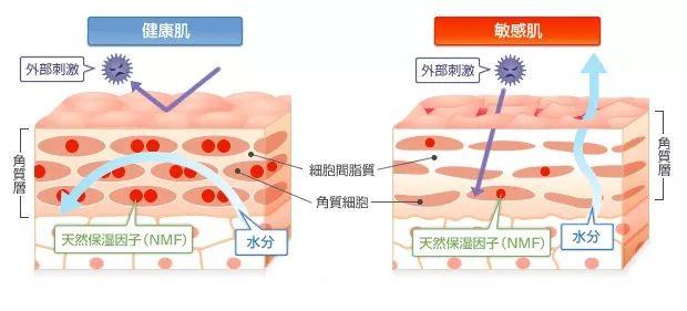 正常的皮肤上都有一层保护性脂肪层称为脂质屏障,主要工作是:维持水分,并保护肌肤免受有潜在破坏性的物质的刺激,如紫外线,风,热和刺激性化学物质。而敏感型肌肤的人,这种屏障通常更弱,更薄,更容易受损,刺激物更容易渗透皮肤并引起炎症。