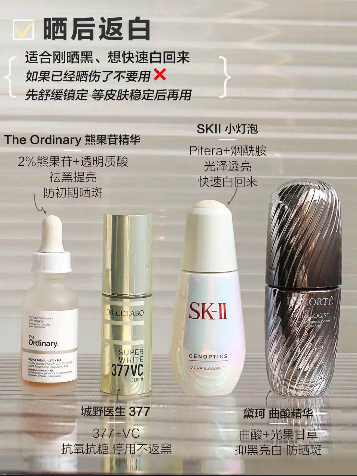3、377:从源头抑制络氨酸酶活性,提亮肤色、淡斑抗氧化。美白原理更直接,在国内上市的377不超过0.5%添加量,敏感肌可用。国外高于0.5%,有一定的刺激性,需要建立耐受。(欧莱雅注白瓶、城野先生377、雅顿 橘灿精华)