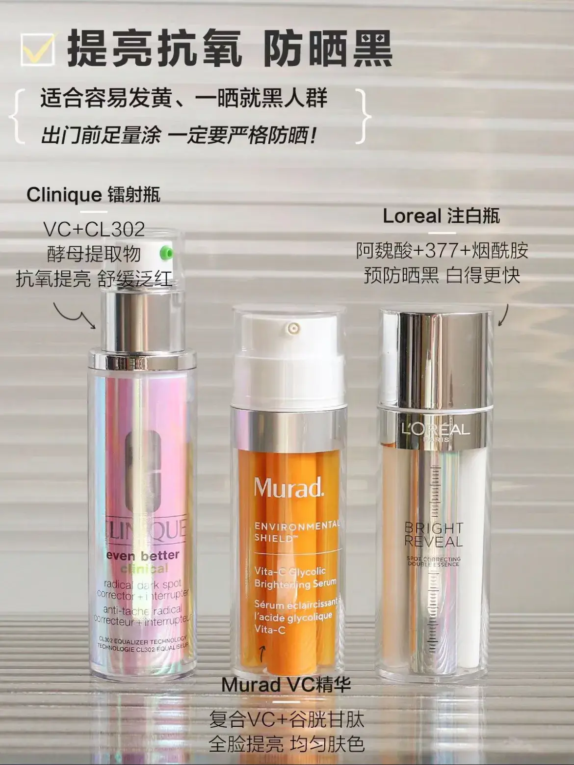 1、VC及其衍生物:干扰黑色素生成,清除自由基,淡斑抗老抗氧化。原形的VC刺激性大且不稳定,所以大多数美白产品中添加的都是VC衍生物。(珀莱雅 双白瓶)