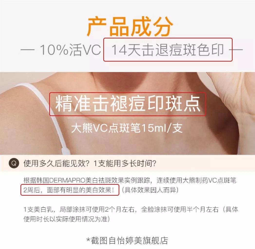 以大熊点斑笔为例,一时间好评如潮,无论是明星推荐还是种草短文,到处都在强调10%VC、富勒烯、14天效果显著,而这些都和官方卖点一模一样。反正李漂亮不做评测时,不会主动把官方宣传研究的这么透彻。