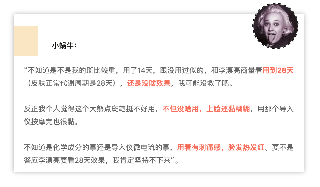 所以,根据两位小姐姐的使用记录来看,至少在14-28天内,大熊点斑笔不但对祛斑/淡斑完全没用,使用感还贼差。