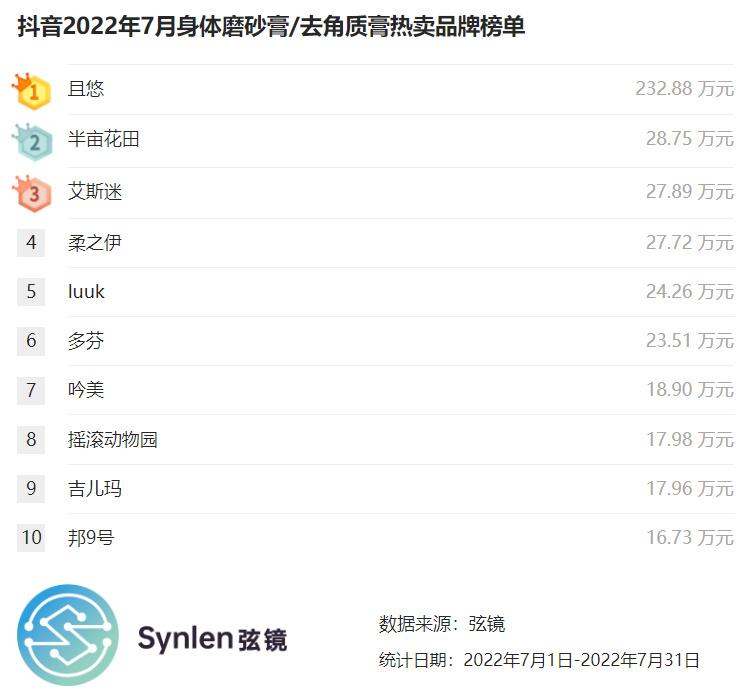 根据电商数据搜索工具——“弦镜”数据显示,抖音平台2022年7月身体磨砂膏/去角质膏热卖品牌榜单,第一名且悠,销售额为232.88万元。第二名半亩花田,销售额为28.75万元。第三名艾斯迷,销售额为27.89万元。从第四名到第十名分别为柔之伊、luuk、多芬、吟美、摇滚动物园、吉儿玛、邦9号。