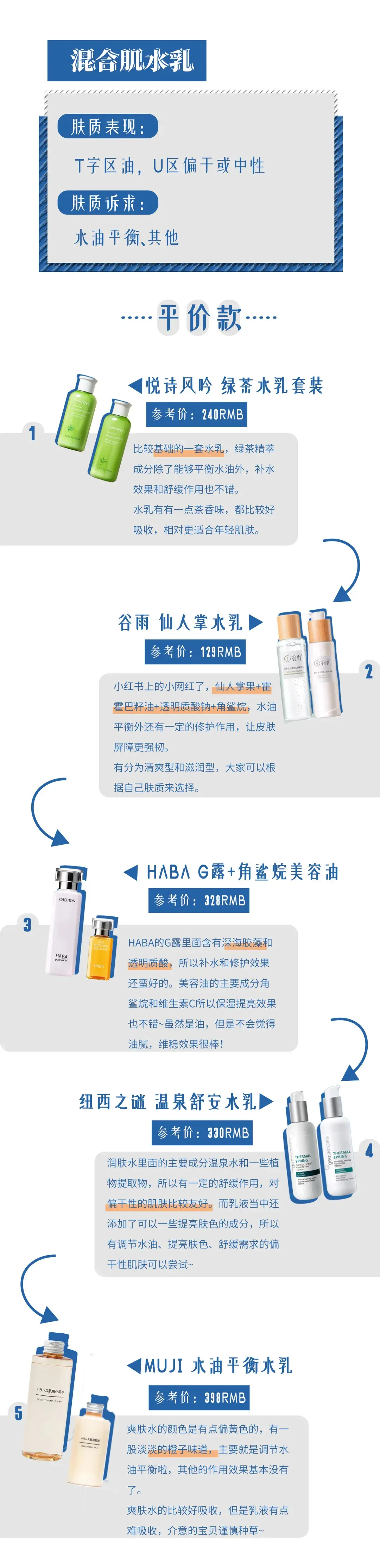 所以混合型肌肤的姐妹其实可以参考其他的肤质来做选择,如果是比较干,就参考1,如果还有点小敏感就参考4~以此类推啦~所以混合肌肤这一块莉耶就换成了调节水油平衡的水乳啦~