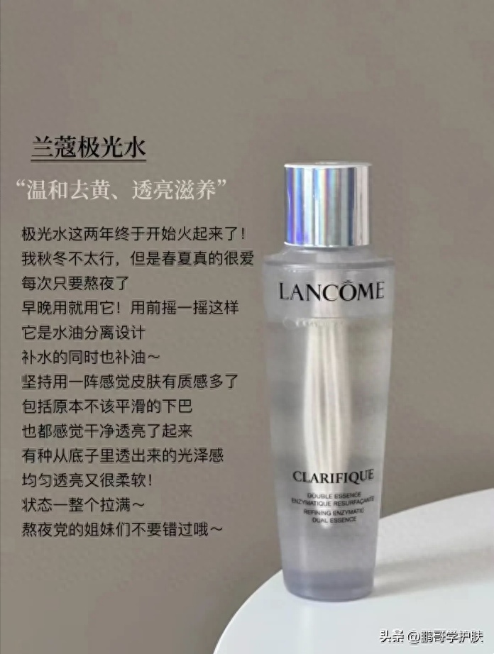 兰蔻极光水是温和去黄、透亮滋养的作用,极光水这两年终于开始火起来了,我秋冬不太行,但是春夏真的很爱,每次只要熬夜了,早晚用就用它,用前摇一摇这样。