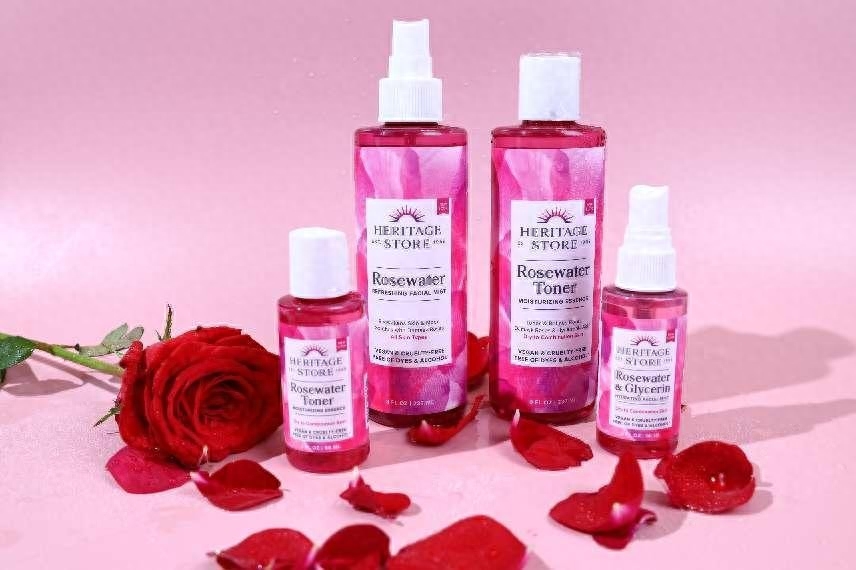 比如这款heritage store的玫瑰水,最开始接触到它是在旅游的时候,看到了这款玫瑰水喷雾,成分列表非常干净,只有大马士革玫瑰花油和水两种成分,还有一款加入了甘油成分,更适合干皮敏感肌。