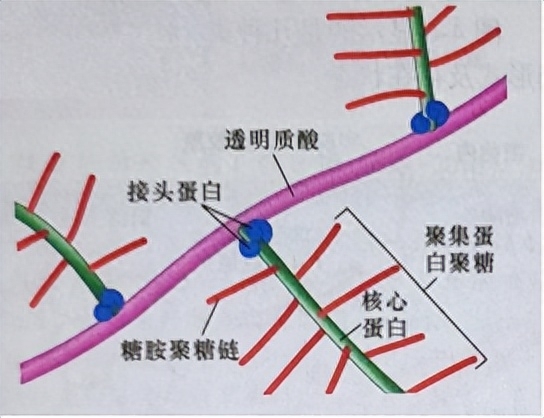 如果把用一棵枝叶繁茂的树来形容,树干就是透明质酸(下图紫色部分),它是一种糖胺聚糖;在树干上分出很多树枝,每根树枝的枝条叫做核心蛋白(下图绿色部分),一个核心蛋白又连接若干条其他类型的糖胺聚糖链(下图红色部分)。
