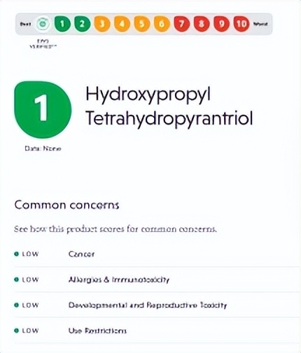 在权威的EWG数据库中,玻色因(INCI名称为:hydroxypropyl tetrahydropyrantriol)的安全指数是1(最安全的级别),在消费者最关心致癌性、致敏性等各项指标中都是低风险。