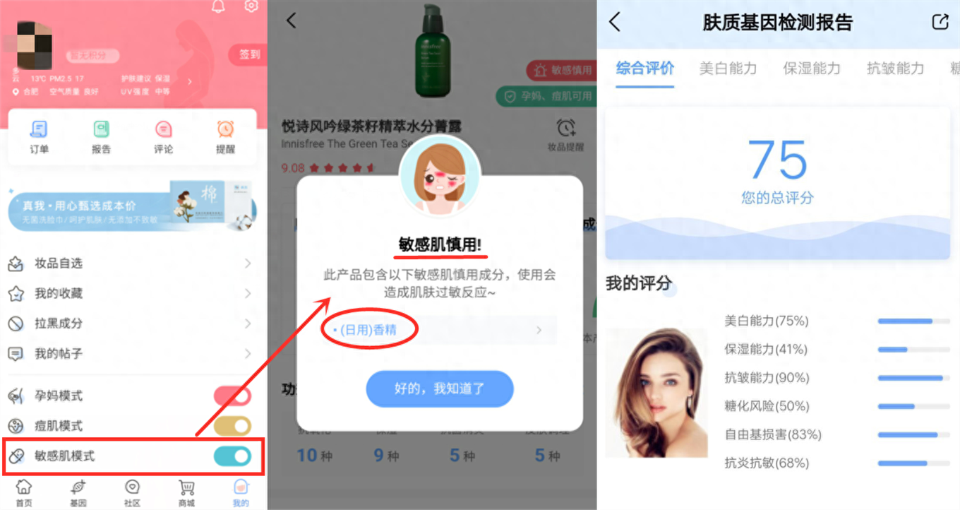 真我APP设有专门的“敏感肌模式”,在用户查询产品的时候,就能根据该模式进行提醒,直接筛选出不适合敏感肌使用的产品。真我APP还提供基因检测功能,通过每个人的个体差异性找出薄弱点,通过这些数据的比对,帮助用户判断自己对于产品的耐受程度。
